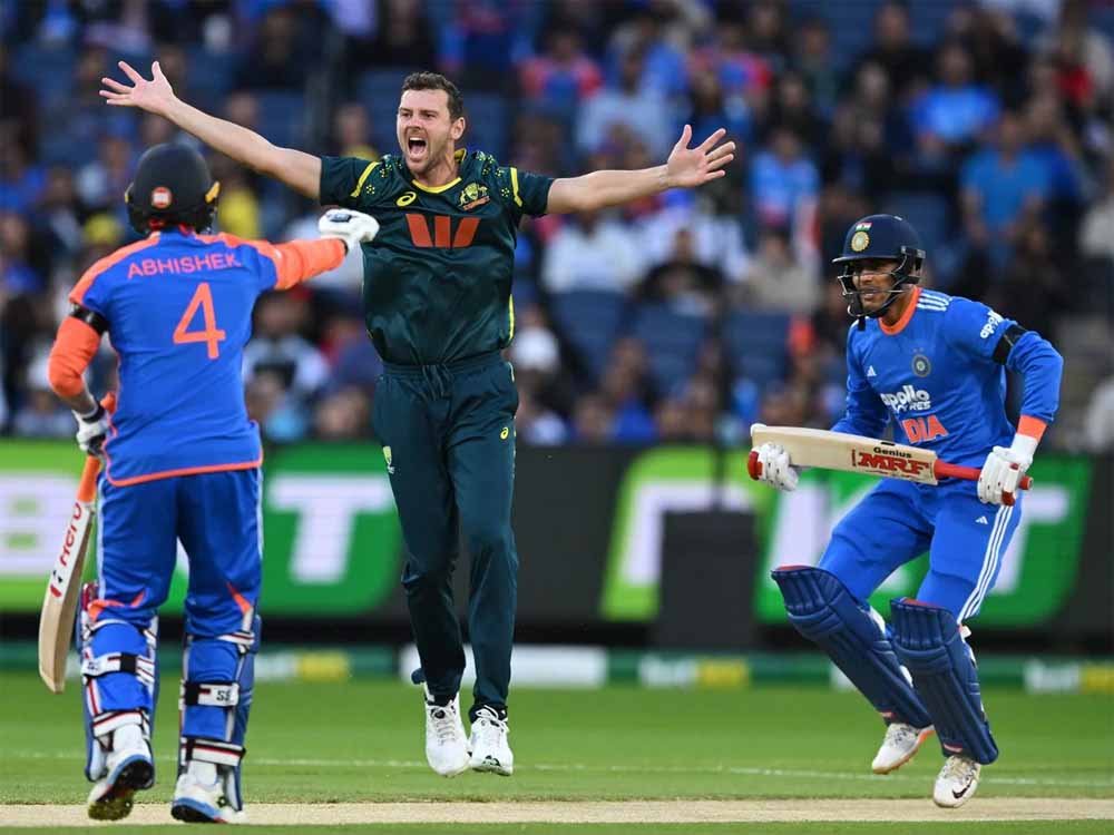 इससे पहले खचाखच भरे एमसीजी मैदान पर भारतीय कप्तान सूर्यकुमार यादव टॉस हार गए। इसके बाद हेजलवुड ने अपनी गेंदों से कहर बरपाया लेकिन फॉर्म में चल रहे अभिषेक एक छोर पर डटे रहे। हेजलवुड ने अपने चार ओवर के स्पेल में 15 डॉट गेंदें फेंकी। उन्हें पिच से अच्छा मूवमेंट मिल रहा था जिससे भारतीय शीर्ष क्रम उलझन में पड़ गया। उन्होंने शुभमन गिल (05) को बाउंसर फेंकी जो उनके सिर पर लगी जिसके लिए अनिवार्य कनकशन जांच करनी पड़ी। इससे पहले गिल उनकी अंदर आती फुल लेंथ गेंद पर पगबाधा की अपील से बचे थे।