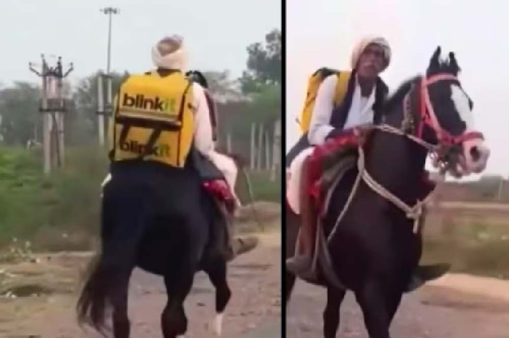 ‘रॉयल डिलीवरी’ का वीडियो वायरल, घोड़े पर सवार होकर ऑर्डर लेते दिखे Blinkit वाले अंकल