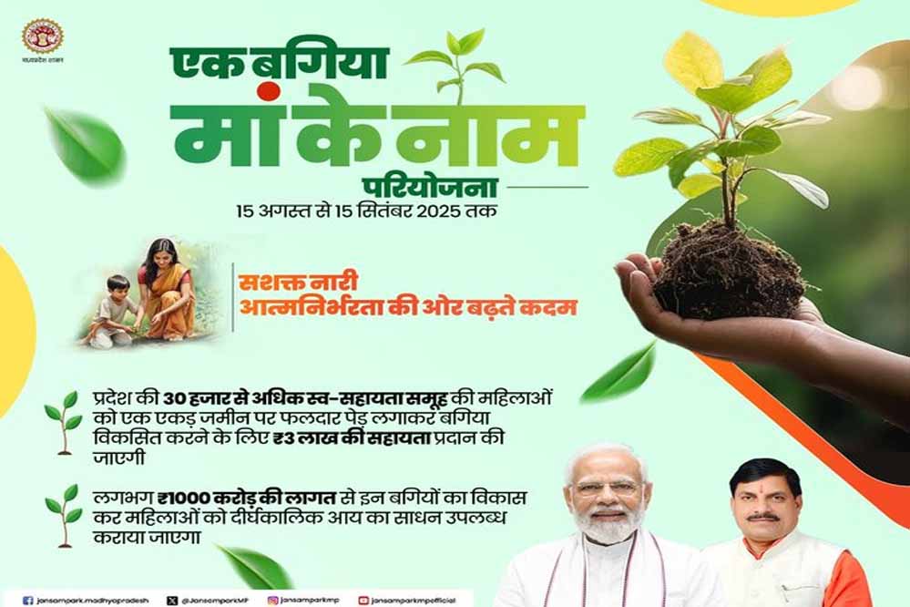 स्व सहायता समूह की महिलाओं को समृद्ध बनाने के लिए प्रदेश सरकार द्वारा लगातार प्रयास किए जा रहे हैं। नवाचारों के माध्यम से महत्वाकांक्षी योजनाएं चलाई जा रही है। मुख्यमंत्री डॉ. मोहन यादव द्वारा महात्मा गांधी नरेगा अंतर्गत प्रदेश में "एक बगिया मां के नाम" परियोजना शुरू की गई है। इसके अंतर्गत स्व-सहायता समूह की महिलाओं की निजी भूमि पर फलोद्यान की बगिया लगाई जाएगी। फलोद्यान की बगिया लगाने को लेकर समूह की महिलाओं ने विशेष उत्साह का दिखाया है। प्रदेश में निर्धारित लक्ष्य से अधिक 34 हजार 84 महिलाओं ने एक बगिया मां के नाम ऐप पर पंजीयन कराया है। परियोजना के अंतर्गत सरकार हितग्राहियों को पौधे, खाद, गड्ढे खोदने के साथ ही पौधों की सुरक्षा के लिए कटीले तार की फेंसिंग और सिंचाई के लिए 50 हजार लीटर का जल कुंड बनाने के लिए राशि प्रदान कर रही है। योजनान्तर्गत प्रदेश में फलदार पौधे लगाने का कार्य भी शुरू हो गया है।